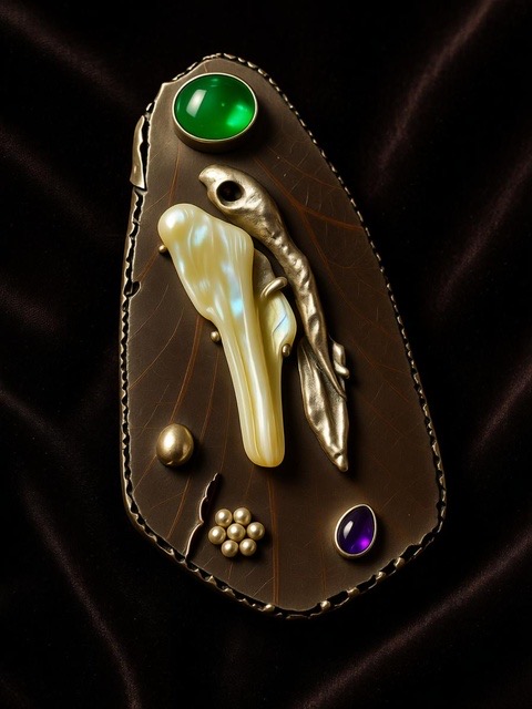 Bespoke Wooly Bark She Oak timber set in Stirling silver, adorned with mother of pearl, Sterling Silver, ornaments and set with Amethyst and Green Onyx. This can be worn as a pin or put onto a chain and worn as a pendent, with the help of the pins to hold it more secure. A multi…