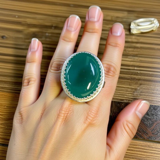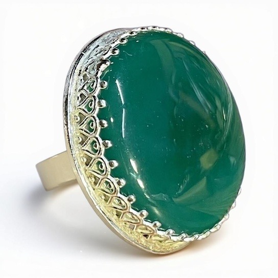 This is a large piece of round green onyx set into a beautiful ornate Sterling Silver setting. It has a solid 6 mm wide Sterling Silver band size 7.