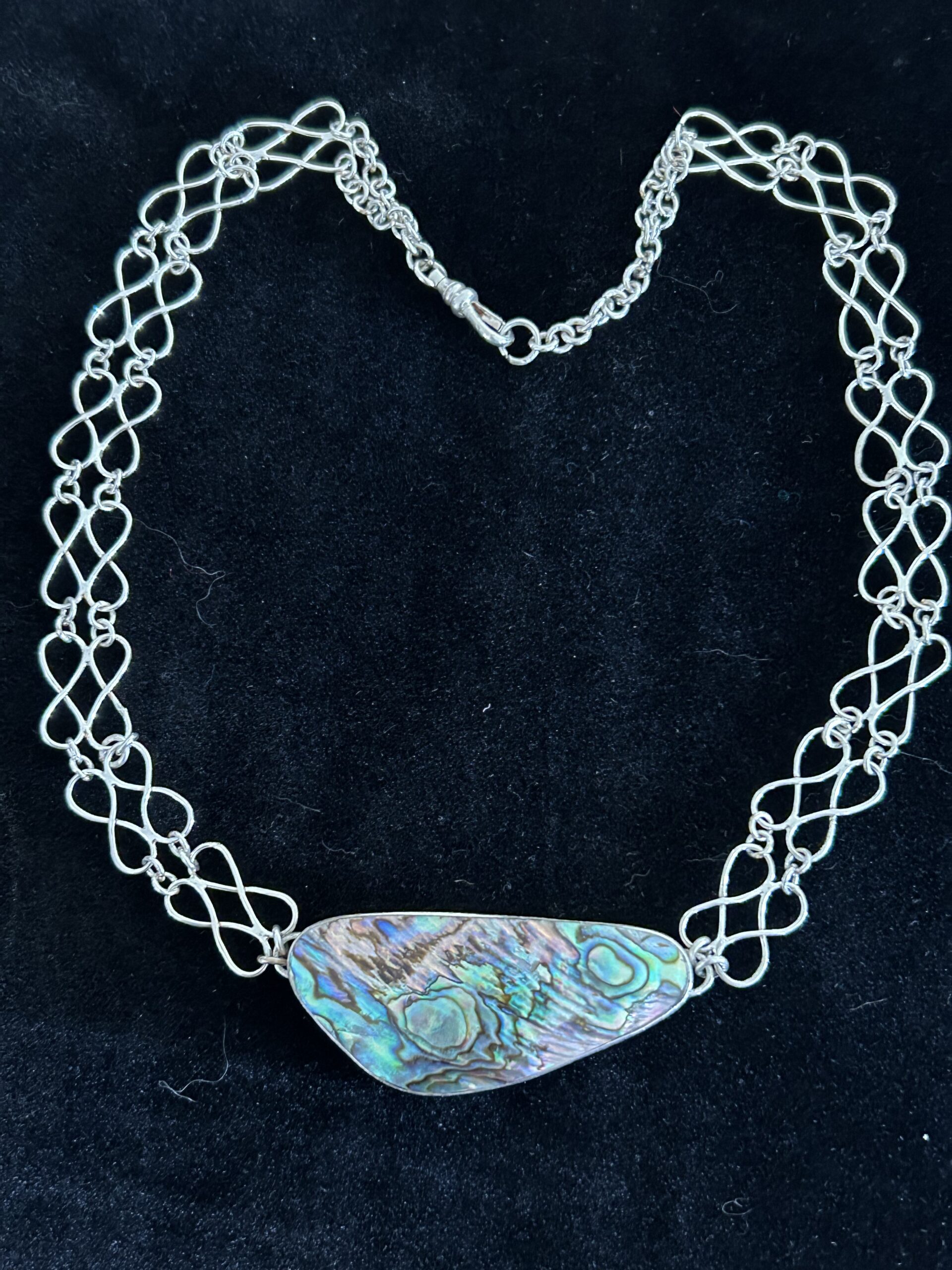 Double strand Sterling Silver infinity chain embracing the ocean – fully soldered sterling silver infinity style chain links embracing Sterling silver set Paua Shell. This is a shorter style necklace.