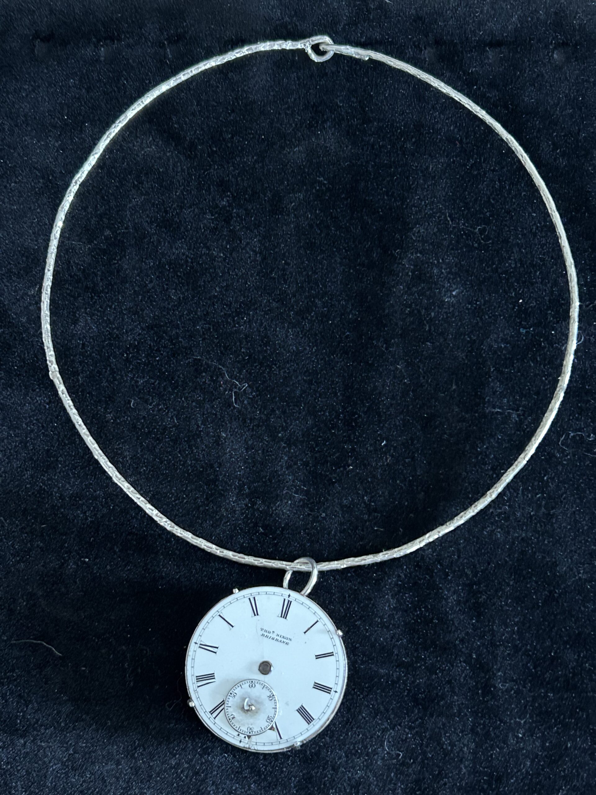 Times Past……Hand worked Sterling silver Textured wire. Enamel Clock Face from an Antique pocket watch which was no longer fixable repurposed being set into a Sterling silver backing and made wearable as a statement piece. Times Past – no hands – No time.